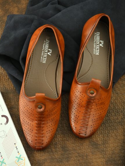 Men Tan Brown Perforations Mojaris Casual Shoes