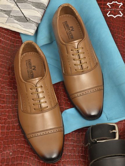 Men Tan Solid Leather Formal Oxfords